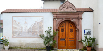 [6] Rheintor (1687) am Schwanenteich, erbaut durch Festungsbaumeister Jacques de Tarade zum Schutz der Rheinbrücke. Die Westfassade weist reichen Figurenschmuck auf;Rheintor-Museum