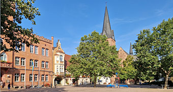 [R] Rathaus (1865 beendet), rötlicher Backsteinbau, mittiger Turm, 1991/93 Erweiterungsbau